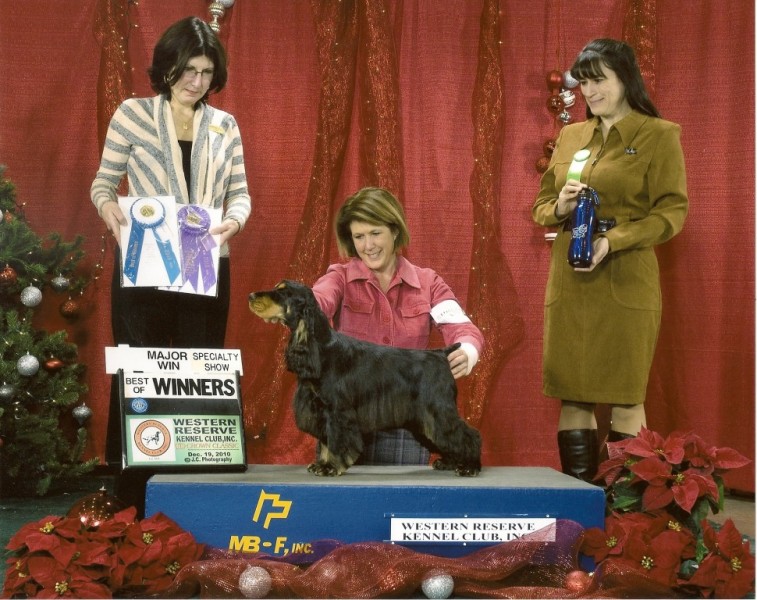 Laila is the first black and tan female Champion for Majestic. Her show career has been filled with very exciting wins! Best In Sweepstakes 3 times, including at American Spaniel Club 2010 just like her sire Cosby did in 2008. She won all three of her majors in 1 weekend as an 11 month old puppy with supported entry and specialty show WB awards. Laila also won a BEST PUPPY IN SHOW win at the Credit Valley shows in Canada.